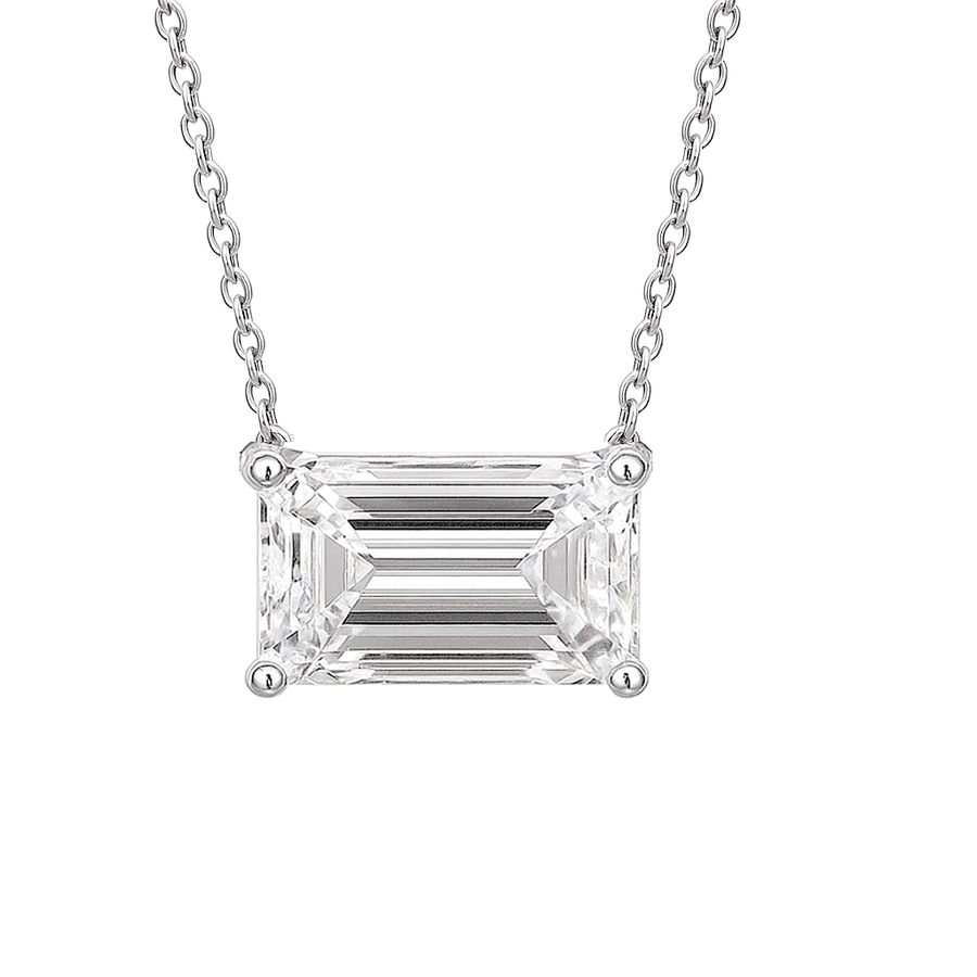Expertly crafted with 2.03 carat lab grown emerald cut diamond bezel set solitaire, this necklace boasts superior quality with a D-VS1 grade and excellent cut. Made with 14kt white or yellow gold, the chain measures 18 inches for a timeless look.