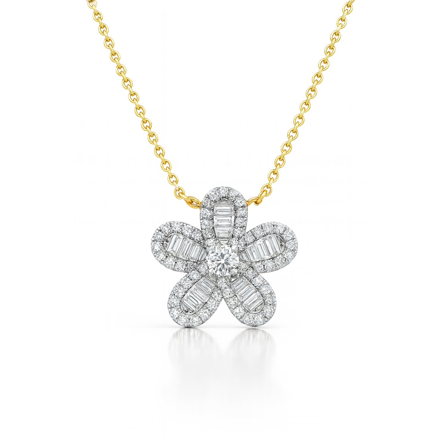 This necklace boasts 75 round and baguette natural diamonds, with a total carat weight of approximately 0.37ctw. The diamonds have a color grade of G and a clarity of VS-2. The pendant is made of solid 14kt yellow gold and comes with an 18 inch 14kt yellow gold cable chain, measuring 1.00mm in thickness.