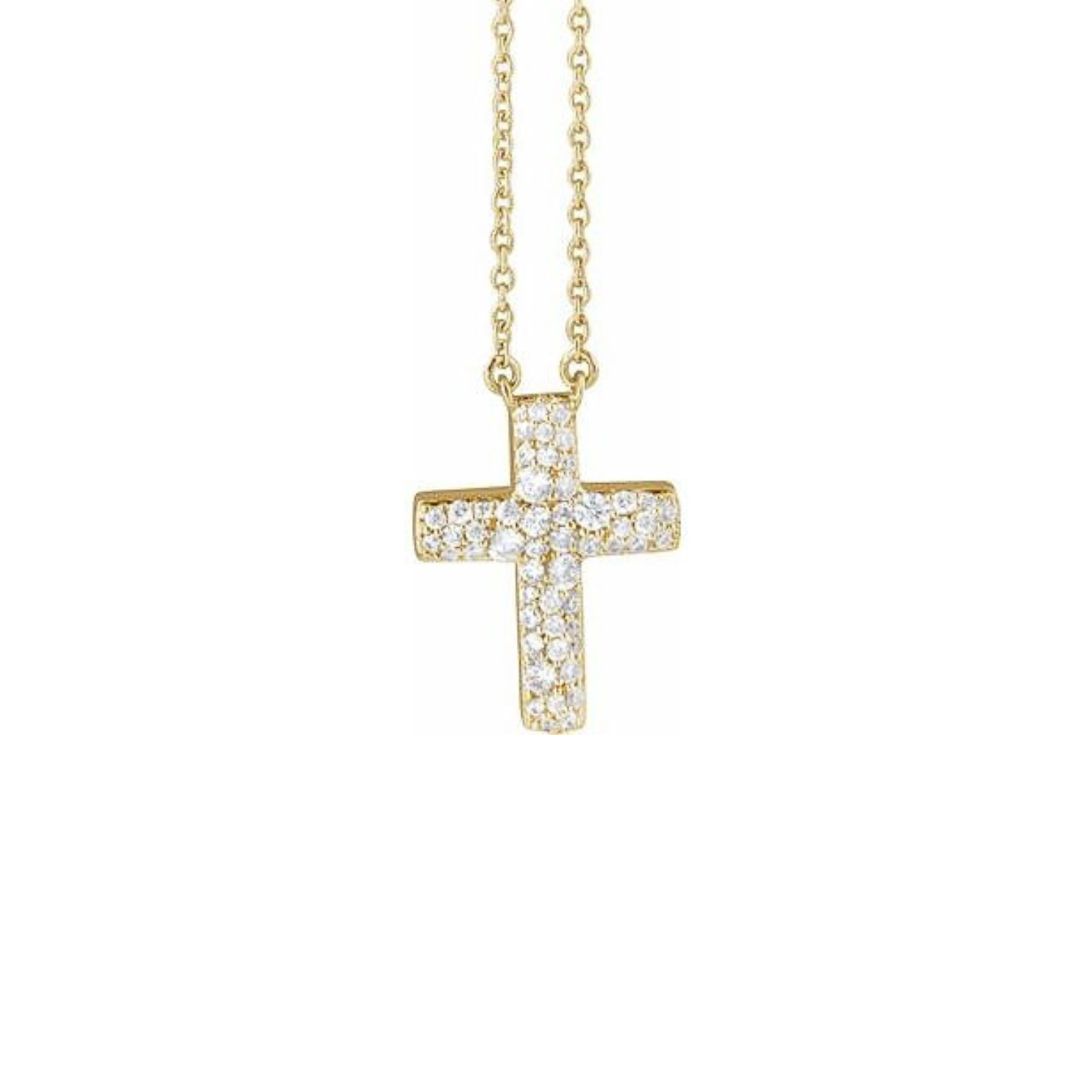 This Diamond Pave' Cross Necklace is adorned with round natural diamonds, totaling approximately 0.45ctw. The diamonds are of G color and VS-2 clarity, and are set in a solid 14kt yellow gold mounting. The necklace is completed with an 18 inch 1.00mm cable chain.