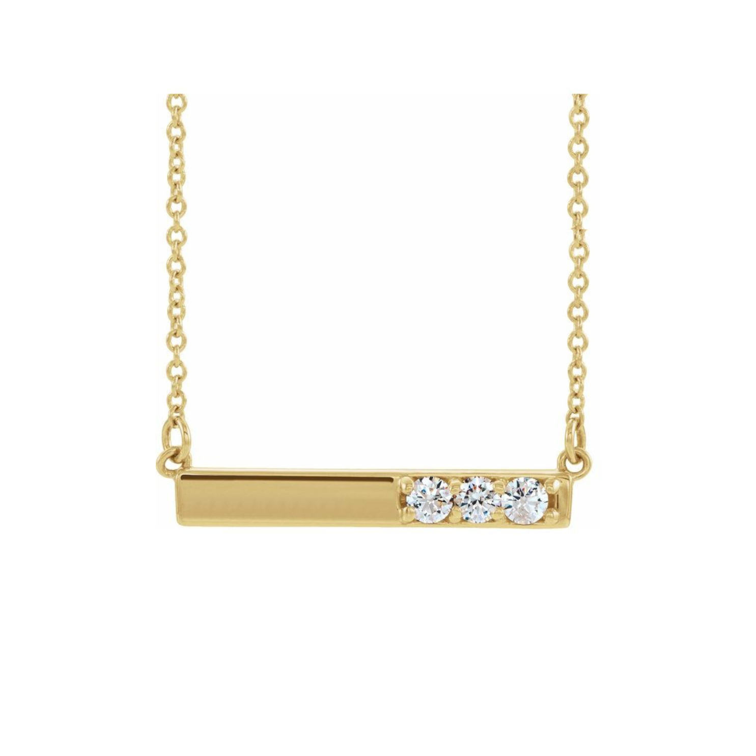 This Diamond Yellow Gold Bar Necklace features 3 Round diamonds with a total carat weight of 0.20ctw and a G-SI1 quality. The round diamond shape is complemented by an 18-inch cable chain, crafted from 14kt yellow gold.