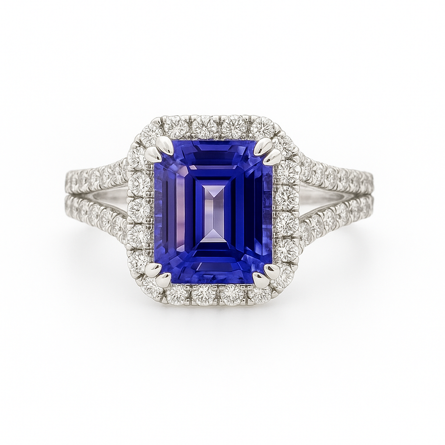 This Emerald Cut Tanzanite & Diamond Halo Ring features 1 Emerald Cut natural Tanzanite gemstone with a total carat weight of approximately 1.65cts and round natural diamonds with a total carat weight of 0.71ctw. The diamonds have a color grade of G and a clarity grade of VS-2, set in a solid 14kt white gold mounting.